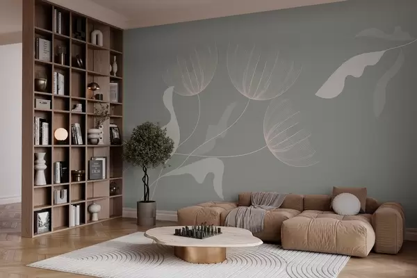 Murais de parede flores elegantes e minimalistas em tons de verde sobre um fundo bege Nr. w03763v2