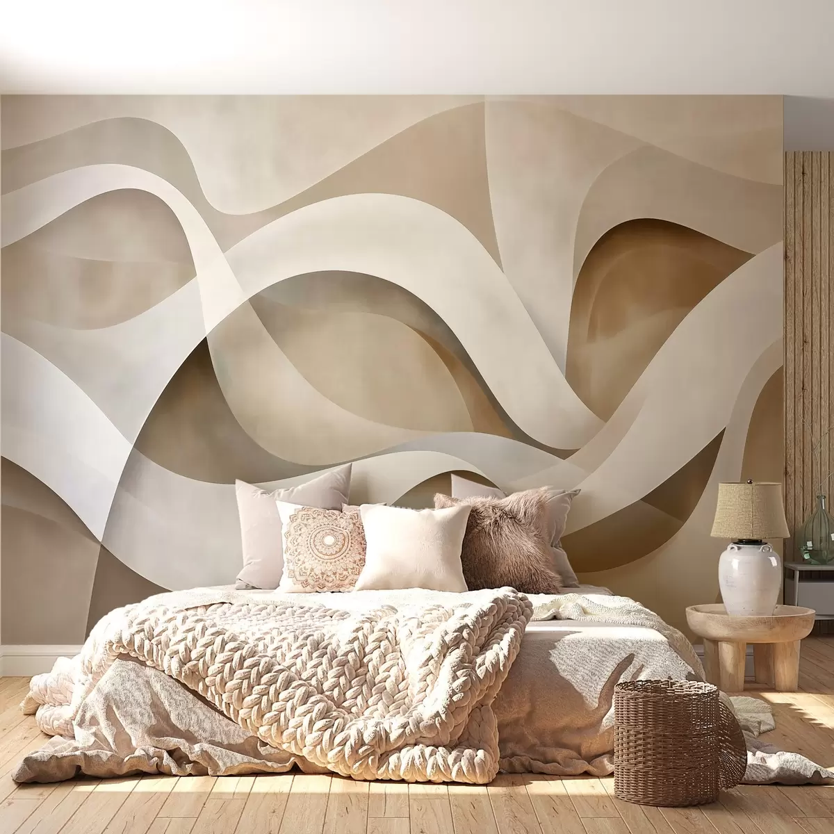 Murais de parede composição minimalista abstrata de formas orgânicas em camadas, cada uma delineada com um rebordo branco suave, preenchida com traços lineares internos densos, como textura de tecido ou papel, curvas fluidas em tons neutros de bege, areia, pedra e marfim, aspeto em relevo Nr. w03940