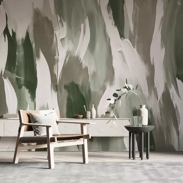 Murais de parede Composição abstrata de pinceladas em tons de verde terra, taupé e marfim, evocando um ritmo inspirado na natureza Nr. w04035v1