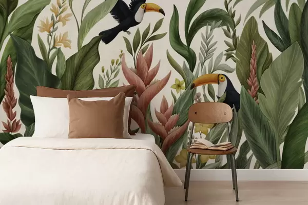 Murais de parede Plantas tropicais e aves de bico grande sobre fundo claro Nr. w05088v1