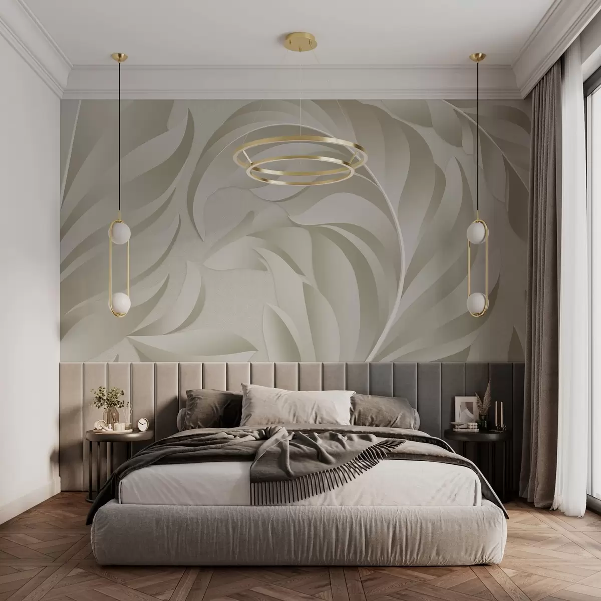 Murais de parede penas grandes com textura em tons de bege e verde-oliva Nr. w05231v1