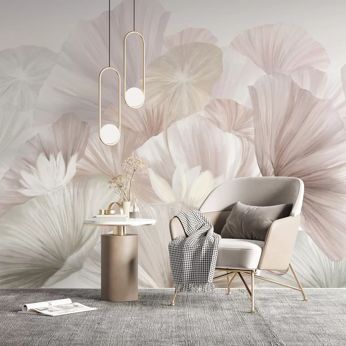 Murais de parede Delicadas folhas de lótus cor-de-rosa com flores brancas com pétalas suaves e emplumadas dispostas numa composição artística natural Nr. w08265v1