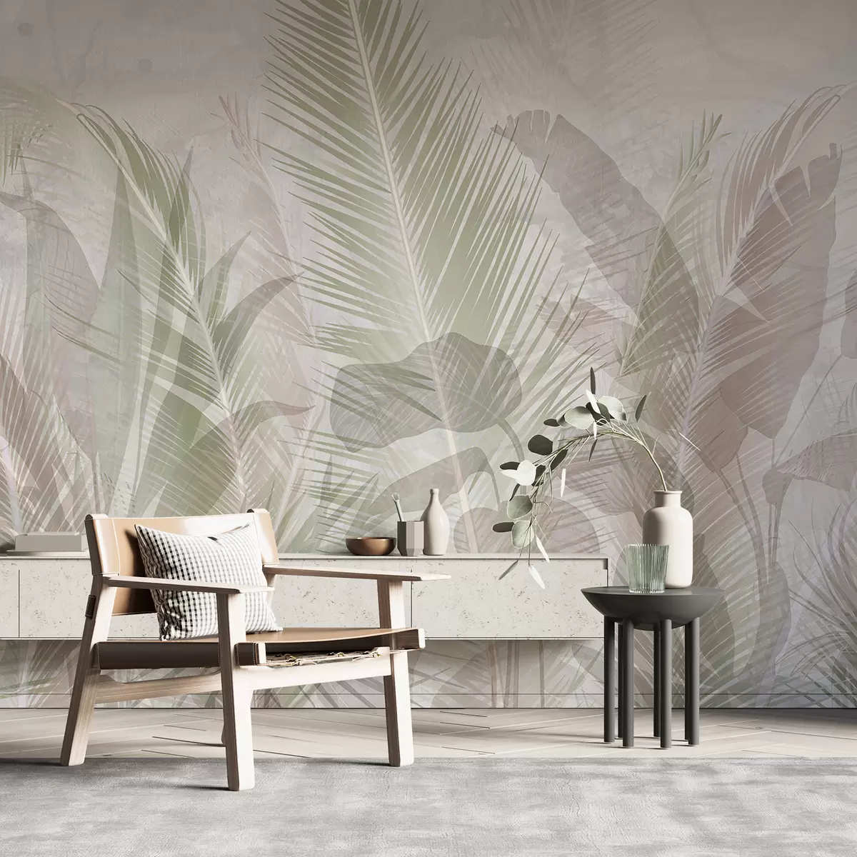 Murais de parede Folhas de palmeiras tropicais em tons pastel suaves, com um fundo texturado esbatido e enevoado Nr. w08326