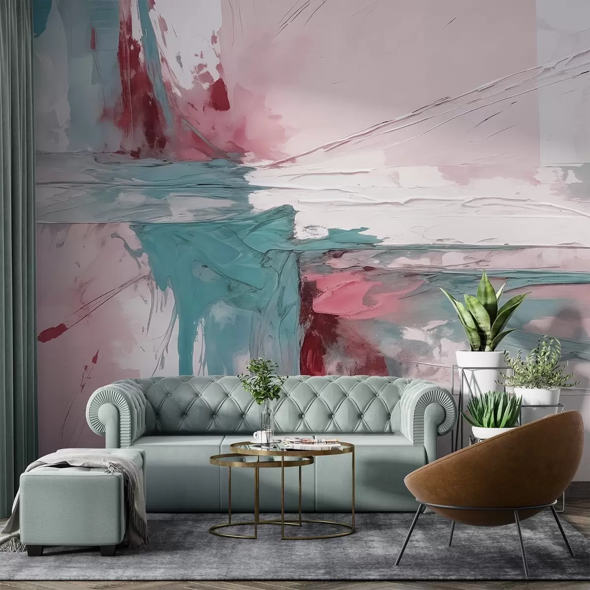 Murais de parede Composição de arte abstrata minimalista com pinceladas arrojadas de tinta rosa, azul e branca Nr. w08414v1