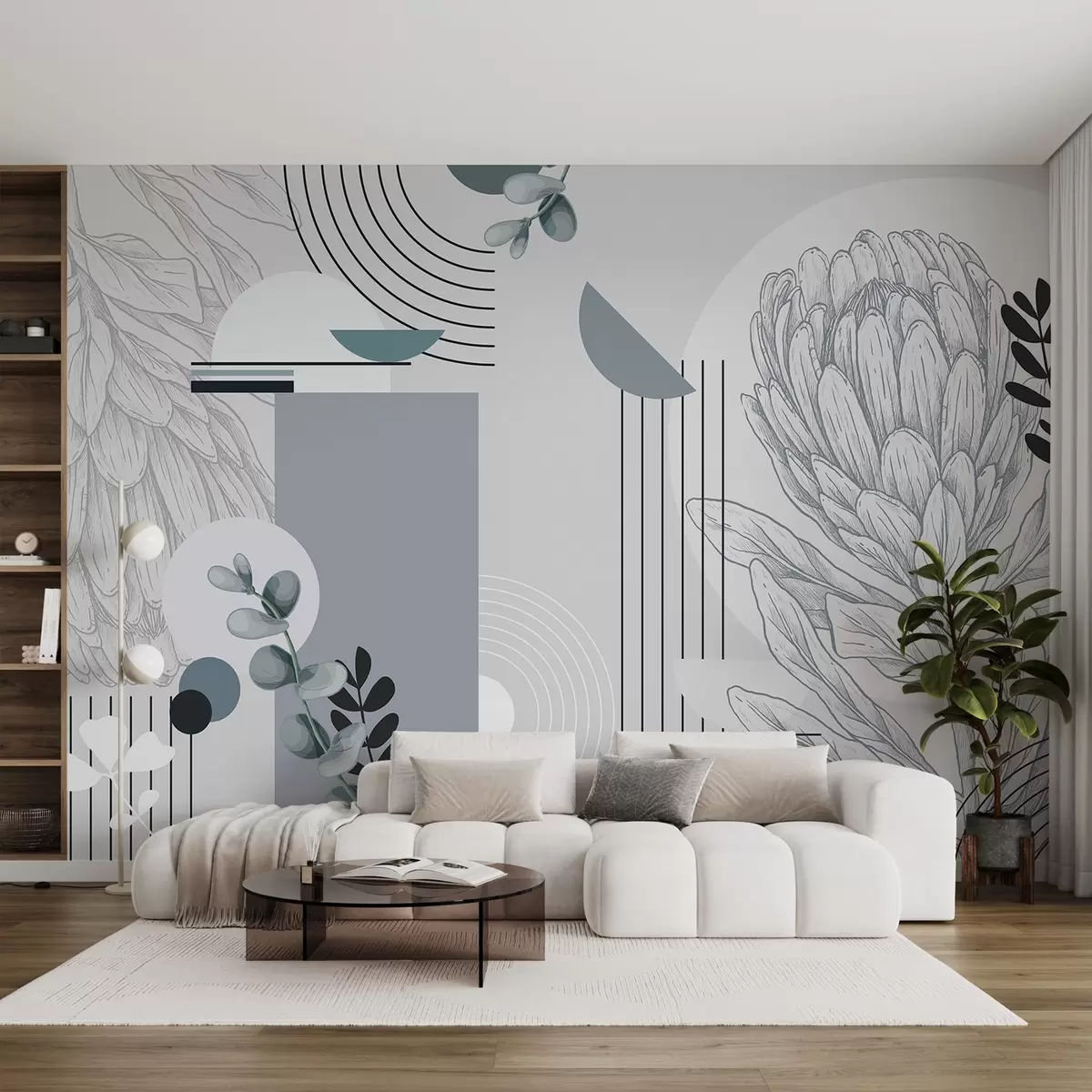 Murais de parede Impressão botânica abstrata com flor de protea, folhas de eucalipto, formas geométricas num estilo minimalista, cores pastel Nr. w08914v1
