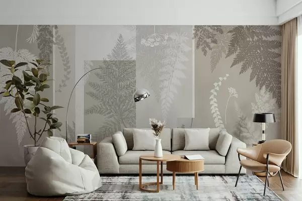 Murais de parede Folhas de feto em bege e branco, dispostas em riscas verticais, criando um estampado botânico e minimalista, cores suaves e discretas Nr. w09007