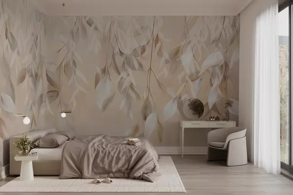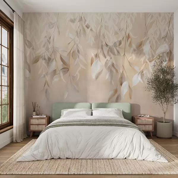Murais de parede Folhas brancas e bege texturadas penduradas com uma paleta de cores suaves, pêssego, cinzento e fundo branco delicado Nr. w09136