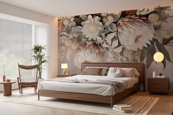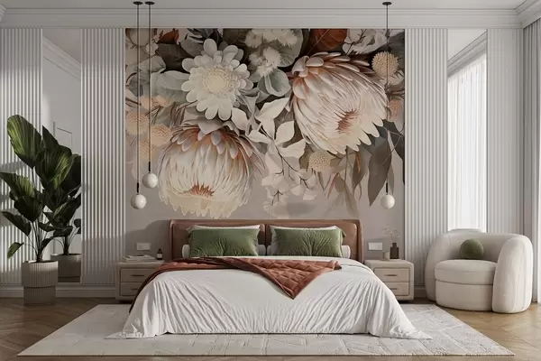 Murais de parede Grande protea texturizada com toques castanhos, margaridas brancas e flores amarelas, fundo bege suave Nr. w09157