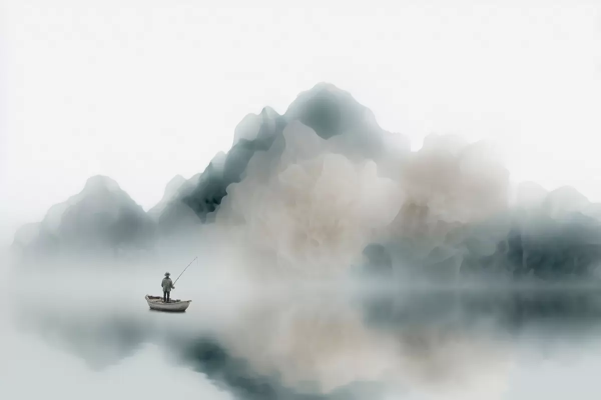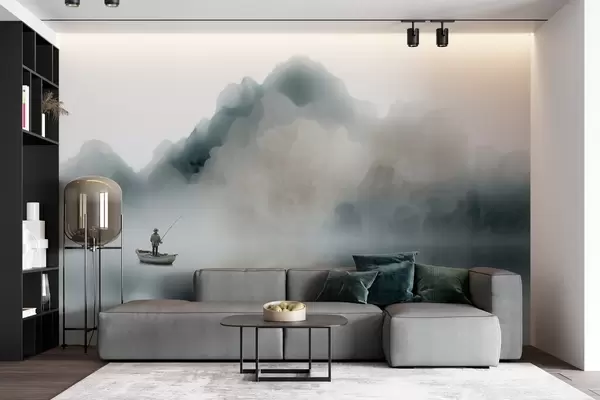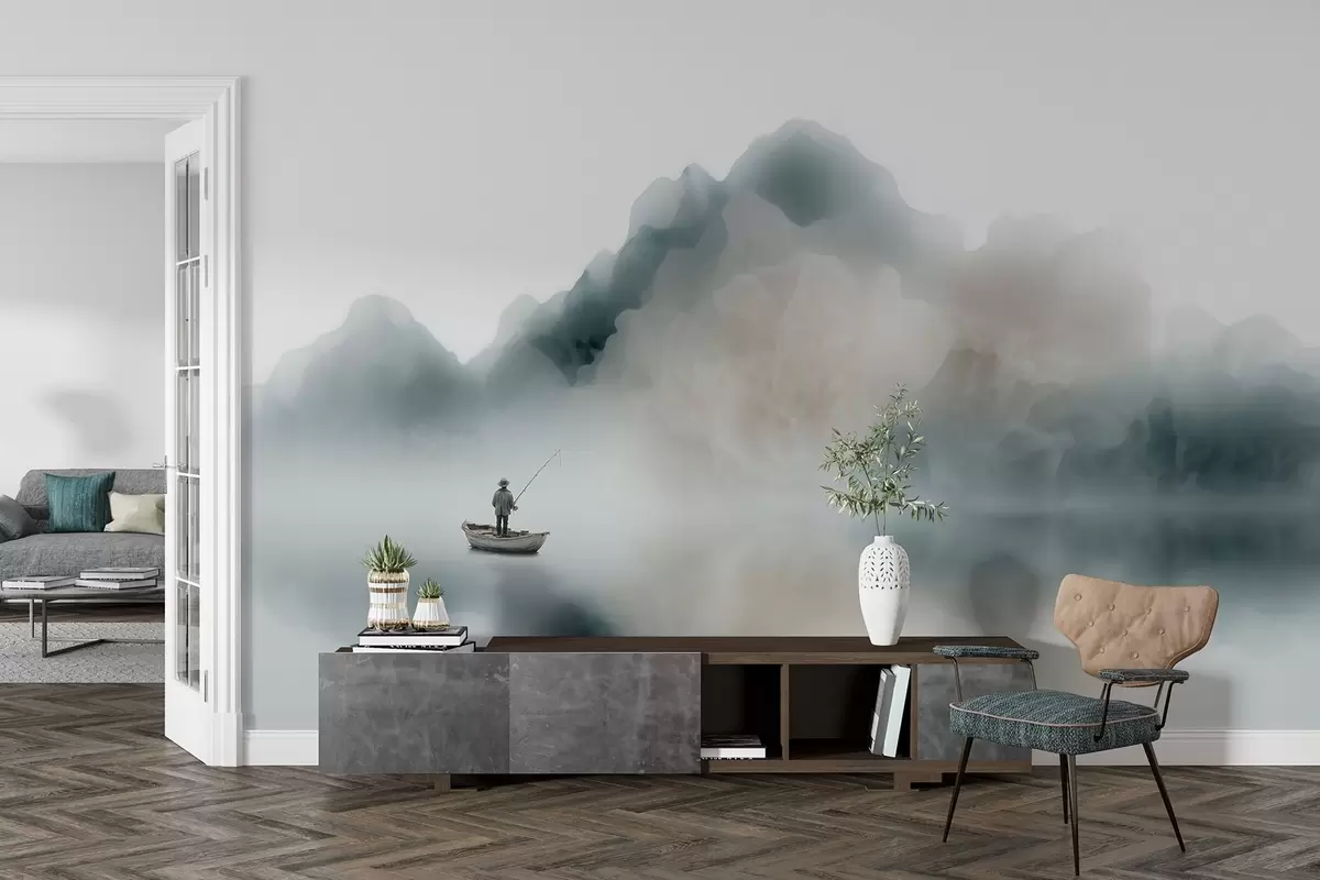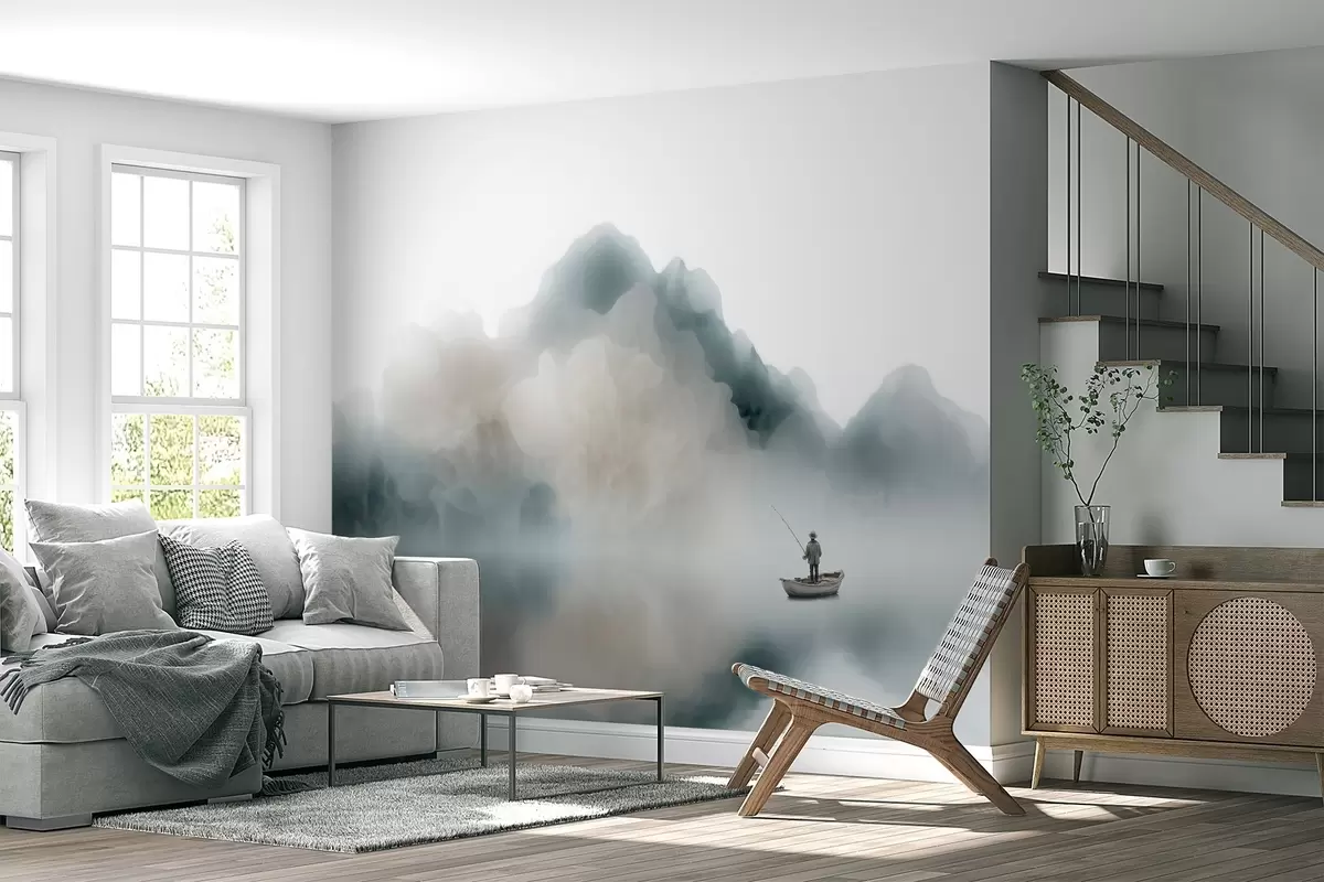 Murais de parede Paisagem montanhosa com um barco e um pescador a desaparecerem numa névoa suave Nr. w09678