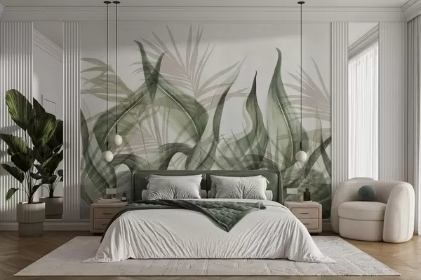 Murais de parede Folhas tropicais em tons de bege e verde contra um fundo branco, estilo aquarela texturizado Nr. w09772v1